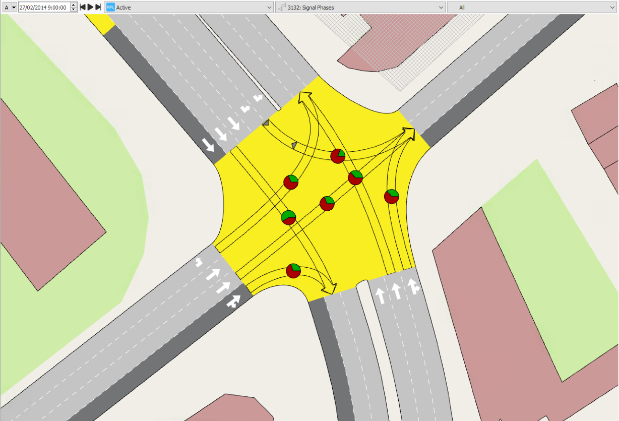 In this exercise, we will view traffic control statistics, being the percentage of red/green time for signals. We will also create a view mode with pie chart diagrams to visualize the statistics as the simulation runs.
