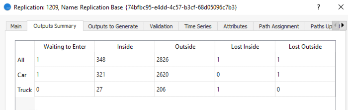 The dialog that is displayed shows the number of vehicles in virtual queues (Waiting to Enter), the number that are currently in the network (Inside), the number that have passed through and left the network (Outside), and the number that have lost their routes (Lost Inside and Lost Outside).