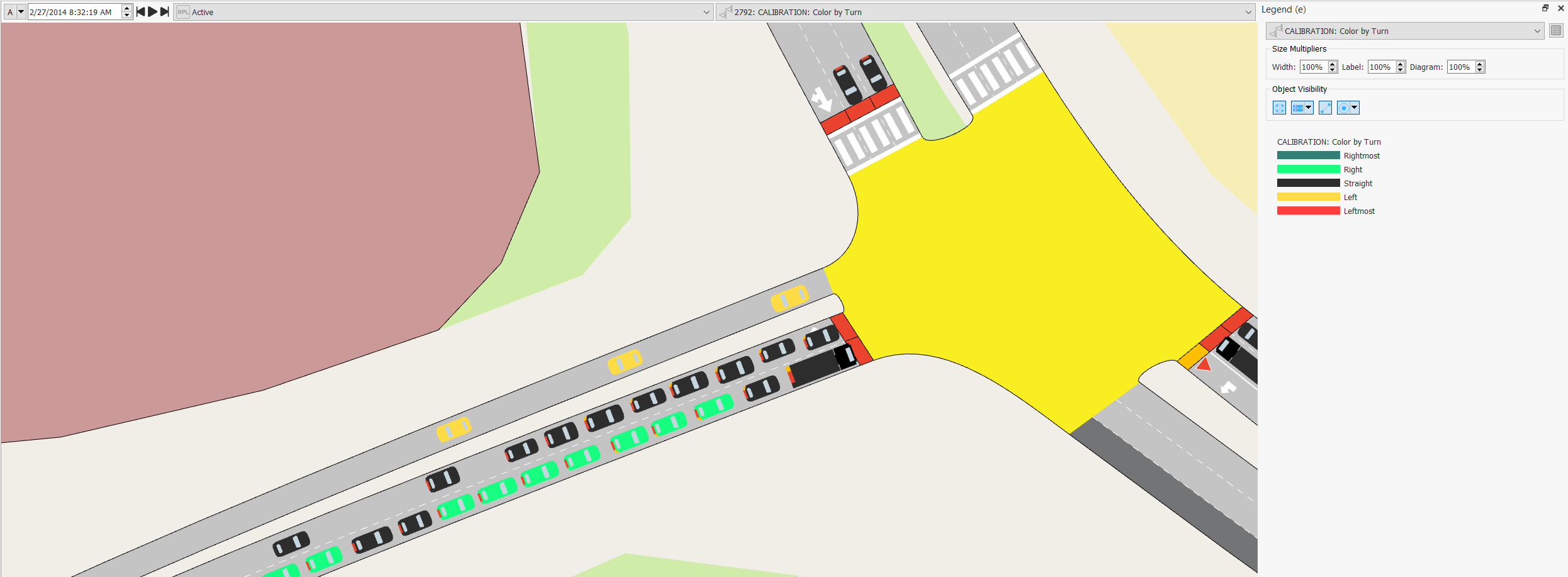 Aimsun Next comes with many ready-made view modes and styles that visualize network conditions and outputs. Some are useful during a simulation, some while calibrating a model, and others are useful for observing results during and after a simulation.