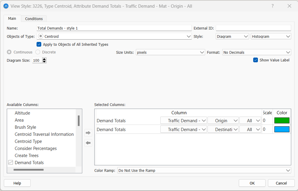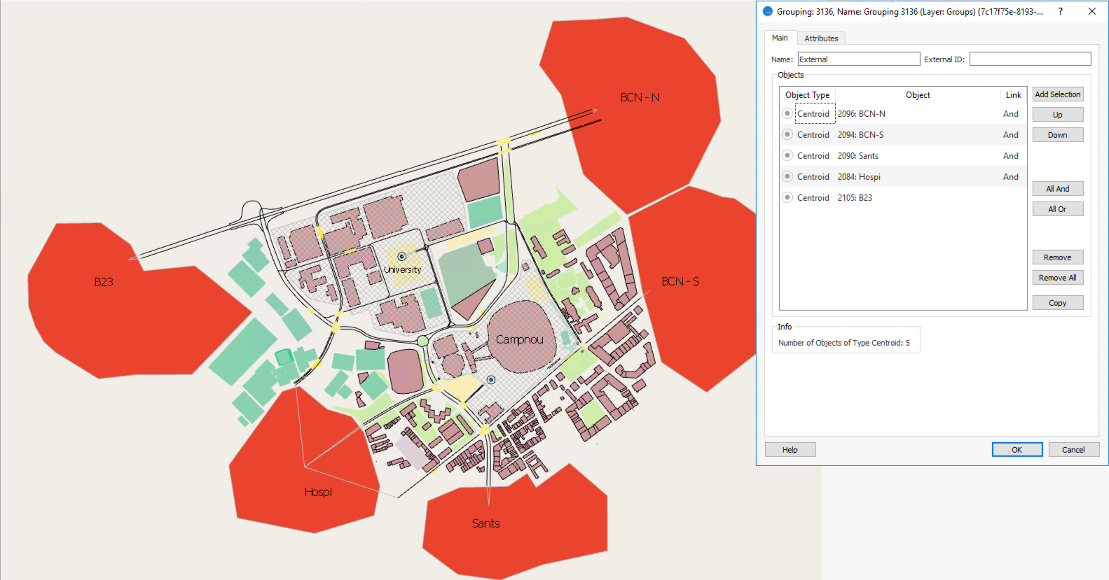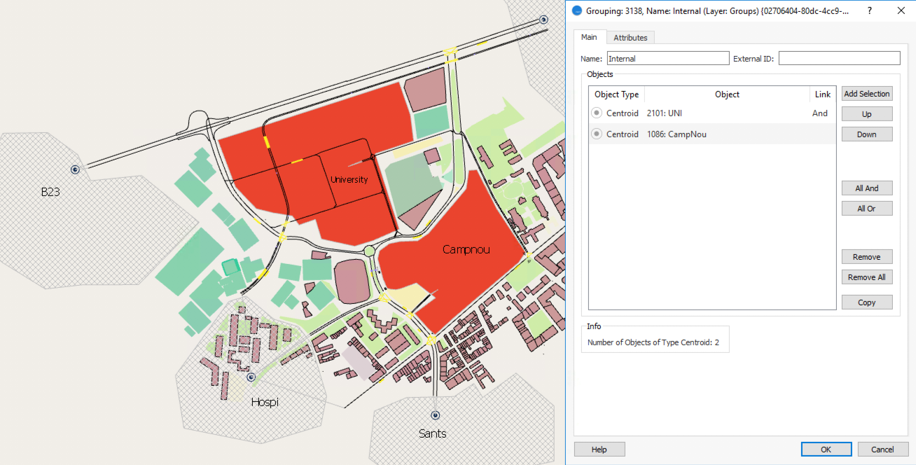 In this exercise we will group objects of the same type together and gather statistics for the group. We will analyze trips between the network's central zone and external zones by creating two groupings of centroids: interior and exterior. In this way we can look at trips between the two groupings rather than the individual centroids.