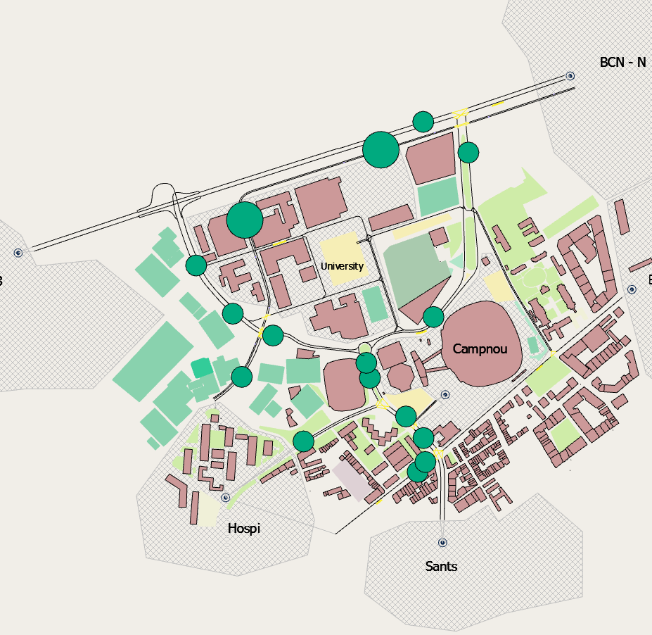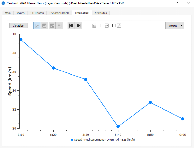 Now we will look at statistics for an OD pair, specifically the average speed of vehicles that have traveled from the Sants centroid to the B23 centroid (shown below). Keep the Centroid dialog open on the Time Series tab.