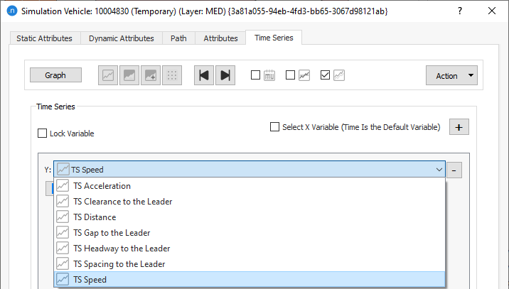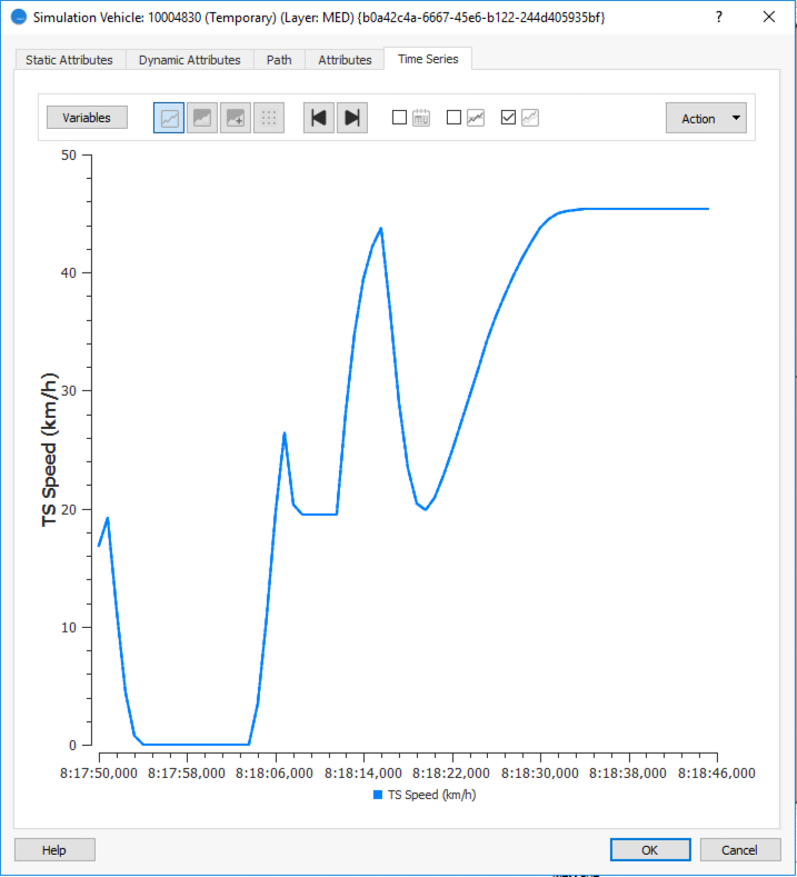 Any vehicle parameter can be shown as it changes over time until it leaves the model. For example, click the variable TS Speed and resume the simulation. Note: If you can't see the variables, you might need to click the Variables button.