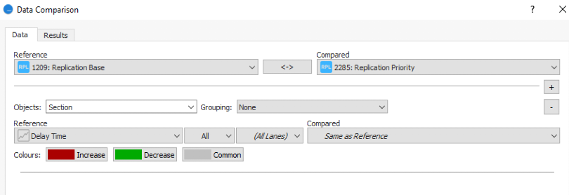 The Data Comparison option allows you to view and compare the results of two simulations, showing the relative and absolute differences. To have data to compare, we need to first simulate the complementary scenario in the network (Dynamic Scenario Priority).