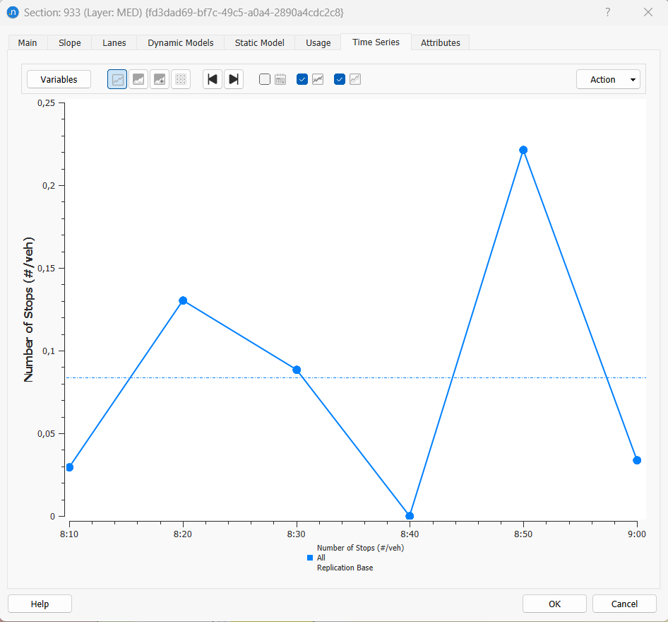 You can visualize time series for any network object. For example, the screenshot below shows the mean number of stops that vehicles make in a selected section per interval.