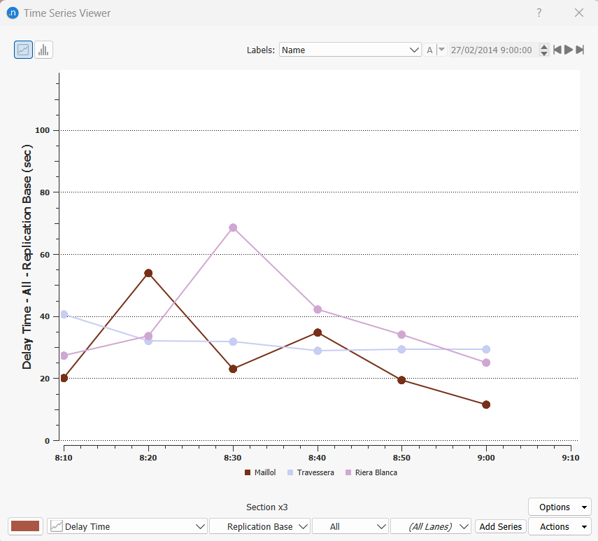 It is also possible to show time series for more than one object in the same graph. In this exercise we will use the Time Series Viewer to compare the delay time in different sections leading into a junction (node).