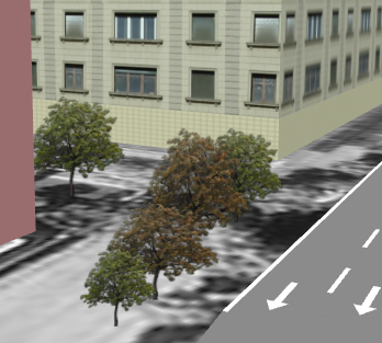 When importing an OpenStreetMap file, some 3D images, e.g. trees, are automatically created and placed in the layers named Natural and Landuse. In this exercise, we will create objects manually: first a tree and then a car-park entrance for our new building. The steps and methods are relevant to all available 3D objects.