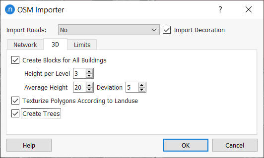 The simple network we are using was created by importing an OpenStreetMap file (see Exercise 1 in the Building a Model tutorial for a recap). When importing, we chose to Create Blocks for All Buildings on the 3D tab, using a Height per Level of 3, an Average Height of 20m and a Deviation of 5m.