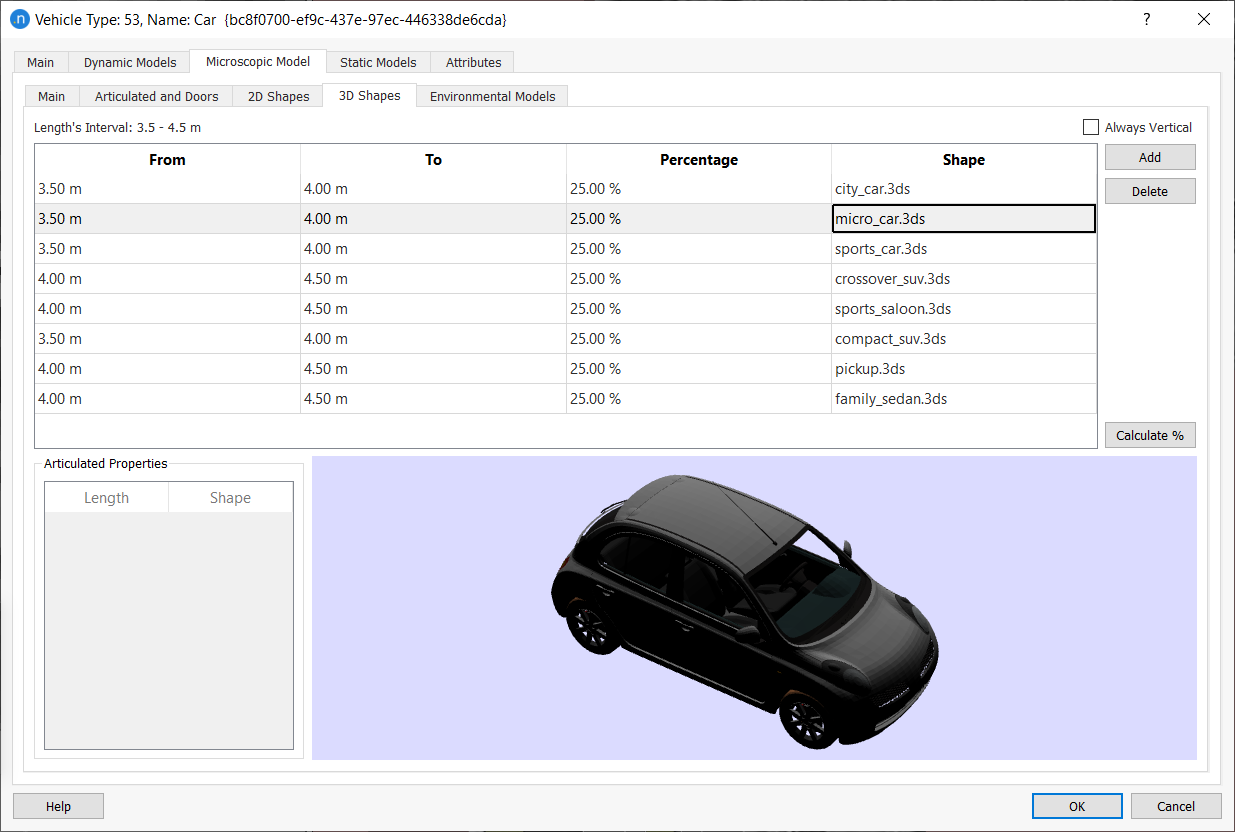 The dialog contains all the different types of car available in the model. It also lists their lengths (in intervals between 3.5m and 4.5m) and the percentage of lengths included (they must equal 100% for each From/To pairing – in the example there are two different intervals, with four entries for each, and each instance = 25%).
