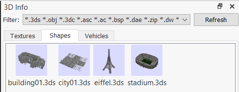 You can find the available 3D files on the Shapes tab of the 3D Info window (see Exercise 3).