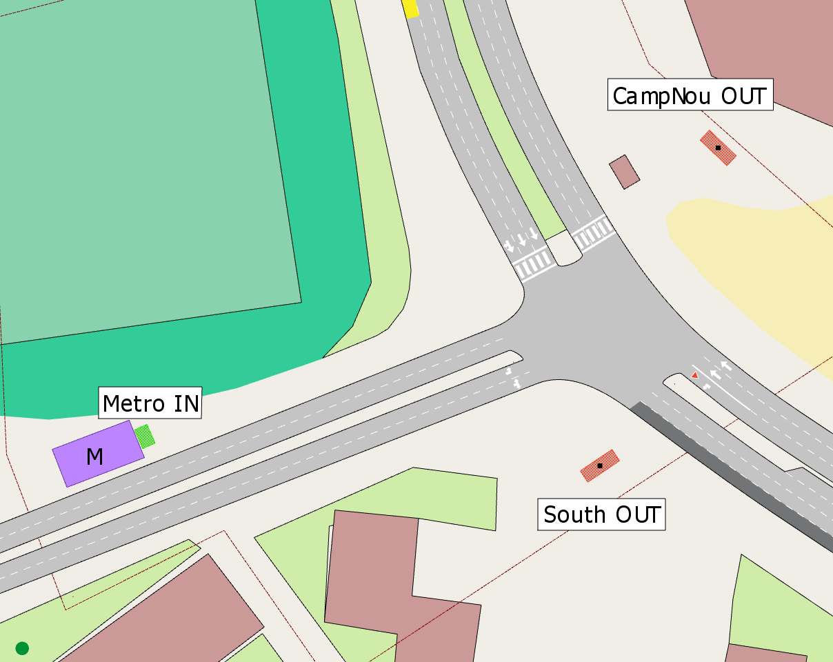 Rename the entrance Metro IN and rename the exits CampNou OUT and South OUT, as indicated in the screenshot above.