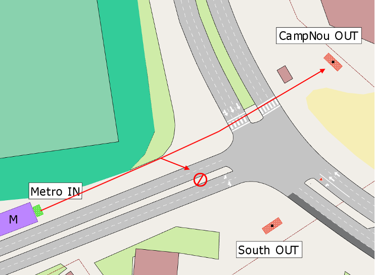 The shortest path between Metro IN and CampNou OUT takes pedestrians over an available crossing, but there is no available path between Metro IN and South OUT.