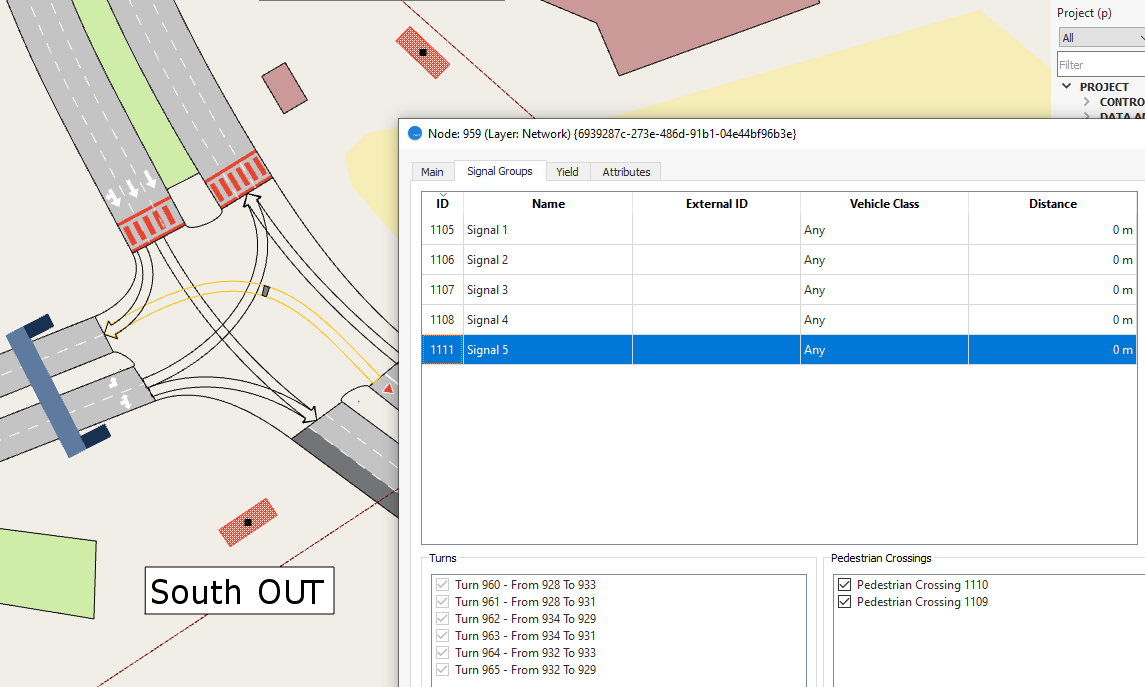 You might recall from earlier tutorials that Node 959 already has signal groups, with Signal 5 linked to the pedestrian crossings. This signal will affect the new simulated pedestrians.