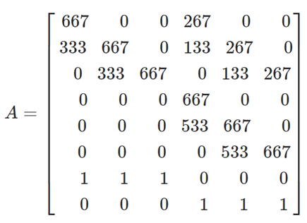 In which \(y_{a1b1}\) and \(y_{a2b2}\) are equal to one reflecting that demand should be conserved (let's assume an elasticity of 1, same weight to counts and to flow conservation, for simplicity). Now we can calculate the matrix A by calculating the assignment matrix and adding the equations for demand conservation:
