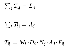 - \(F\) is a deterrence function reflecting the cost of the trip \(i,j\).
