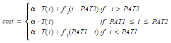 The scheduling cost is derived from a Function which evaluates the cost based on the difference between the arrival time and PAT1 and PAT2. This function can be a simple asymmetric linear function reflecting the perception that arriving early carries less of a scheduling cost than arriving late or it can be an exponential function reflecting the perception that the penalty for arriving late accumulates more rapidly as the delay increases.