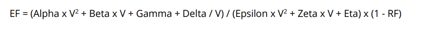 Here, EF is the 'hot' emission (grams/km); greek coefficients are derived constants which are defined for each COPERT vehicle type, V is the average speed in the trip. And RF is a reduction factor (correction). The COPERT Vehicle type is defined by: