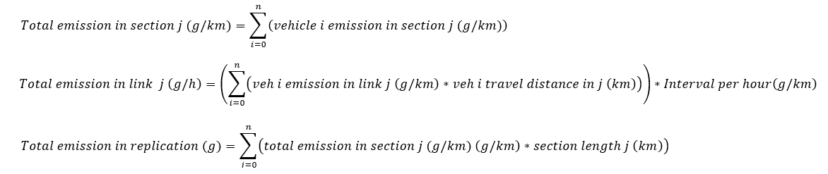 Within Aimsun Next, the average speed of an individual vehicle within a section or a link are used to then derive the emissions of that vehicle locally. The total emissions for the network is taken to be the sum of the emissions of all vehicles on all sections.