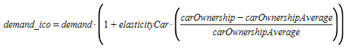 The transportation mode that represents the Car Mode must be selected, and an Average Car Ownership to which the ownership per zone will be compared. When a zone has a car ownership above the average, the relative car use will also be higher (and the opposite for the case when the ownership is below average). The elasticityCar parameter, together with the relative difference of ownerships, will help modulate this dependency. The number of trips will be modified following the rule (demand_ico being the demand after applying the Influence of Car Ownership):