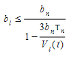 At the same time, the maximum speed that the same vehicle \((n)\) can reach during the same time interval \((t, t+dt)\), according to its own characteristics and the limitations imposed by the presence of the lead vehicle (vehicle \(n-1\)) is: