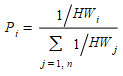 In a Static Transit Assignment, the choice of path is determined by the probability of a service being first to arrive rather than by modeling detailed passenger vehicle timings. The probability is derived from the expected wait time, assumed to be half the inter-arrival interval, at each Transit Stop. The probability that line i will be selected is in the ratio of the line frequency, divided by the combined frequency expressed as 1 / headway