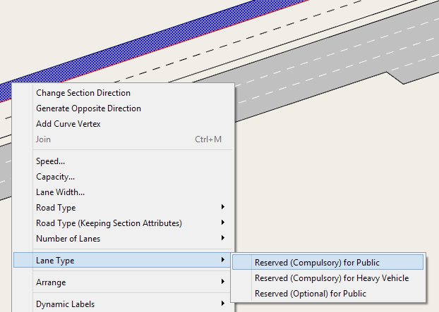 Use the combo box to select the reservation type of the lanes, if they are reserved. Alternatively, to reserve a lane for a particular vehicle class; select the section, activate the context menu with the mouse over the lane that will be changed, and choose the Lane Type from the list.