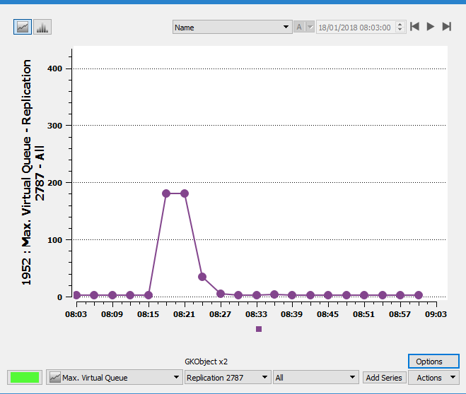 The complete history of the virtual queue for the simulation period is available from the Time Series Editor as shown below for the same queue.