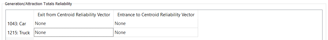 Generation/Attraction Totals Reliability, per user class. Select the centroid vectors that contain the reliability values of the entrance and exit centroid counts. Leave as None if this parameter is not being used.