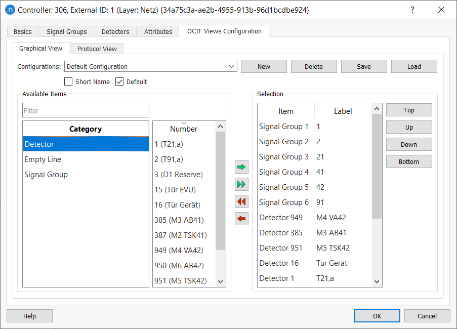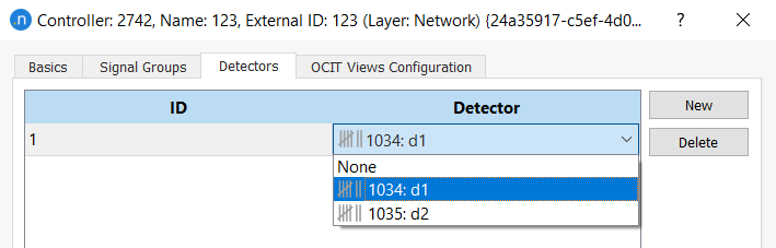- Connections: Defines the connections between the controller and those objects it controls. Click New and then click on an object in the 2D view to add an object. All junctions and detectors controlled by the vs|plus controller must be connected and listed here.