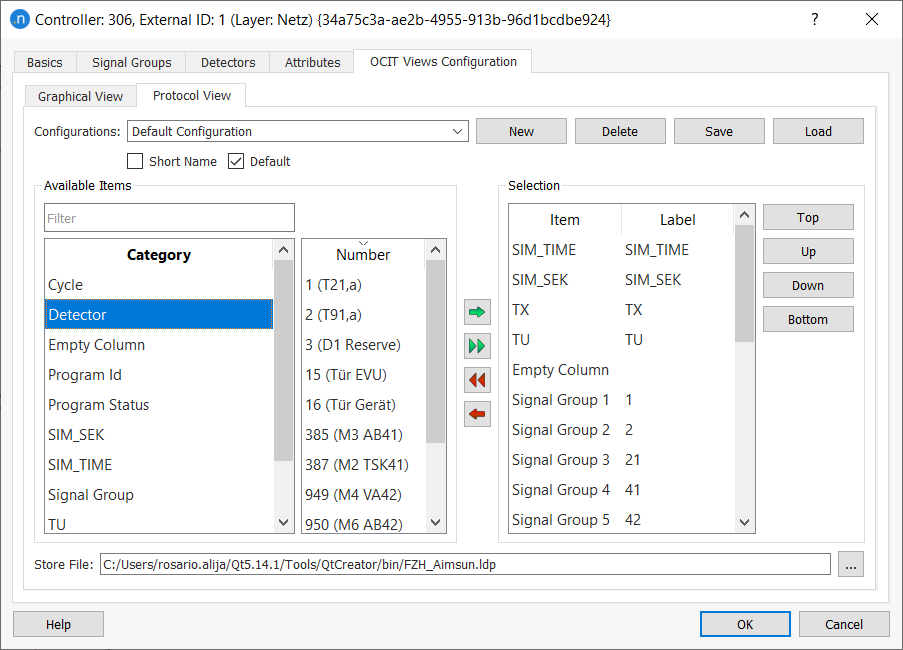 From Aimsun Next 22, the vs|plus controller complies with OCIT (Open Communication Interfaces for Road Traffic Control Systems) standards. The OCIT View Configuration enables you to select which graphical elements and which protocols to display in the Controller dialog while running the simulation. When a simulation is running, the controller presents an extra tab, named Simulation Control. This tab displays the elements you specify on the OCIT View Configuration tab.
