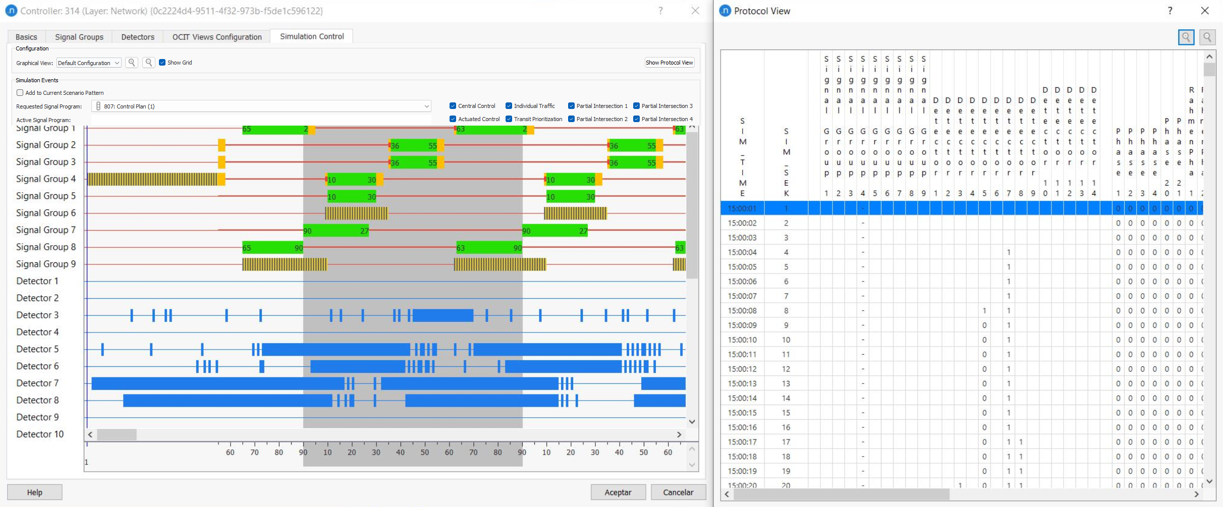 The Simulation Control tab provides provides two views of the control actions: a Graphical View showing the state of phases, stages, and detectors, and a Protocol View which displays details of signal actuations.