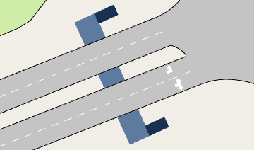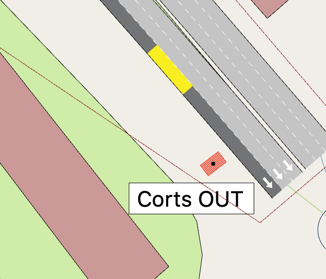 Draw the object pictured below across the two road sections near South OUT. You can resize, move, and rotate it as desired. At the moment it appears underneath the sections. We will fix this in the next step.