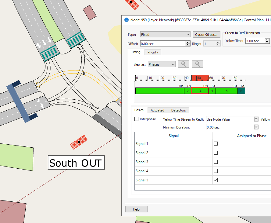 You might recall from earlier tutorials that Node 959 already has signal groups, with Signal 5 linked to the pedestrian crossings. This signal will affect the new simulated pedestrians.