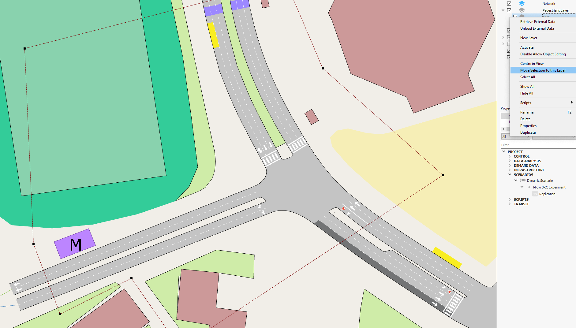Optional: If you want pedestrians to avoid the greenery, ensure that the OpenStreetMap layer can be edited (Allow Object Editing) and then right-click on the greenery and select Generate Pedestrian Obstacle.