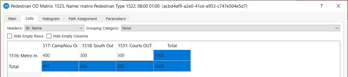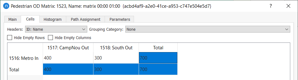 Hint: You may find this pedestrian OD matrix under Project > Pedestrians > Pedestrian Centroid Configurations > Pedestrian CC > Pedestrian OD Matrices.