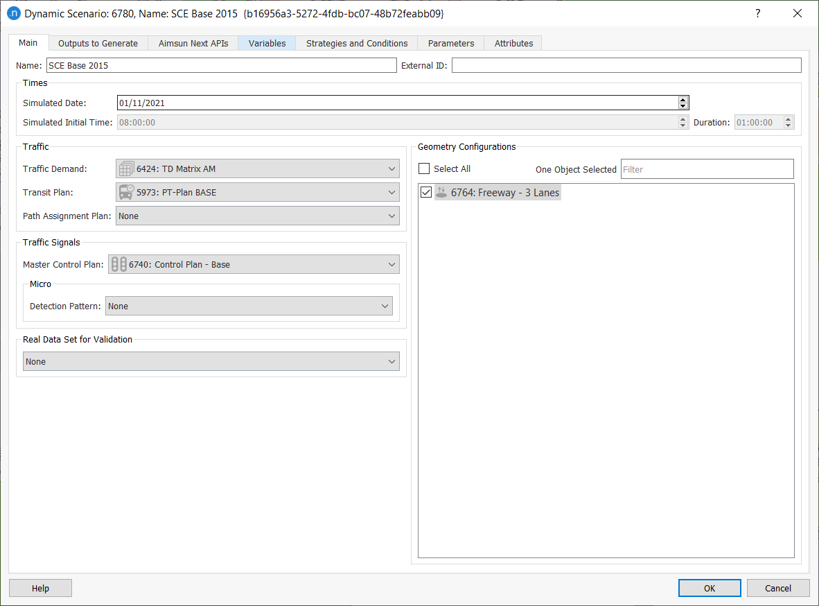 The scenario object sets the main input and output objects for a simulation. It specifies the level of simulation and the traffic demand, transit plan, path assignment plan, master control plan and real data set for validation. Additionally, it can specify traffic management strategies and any alternative geometry configurations. Any API modules, required to extend Aimsun Next's capabilities for bespoke reasons can be activated here also.