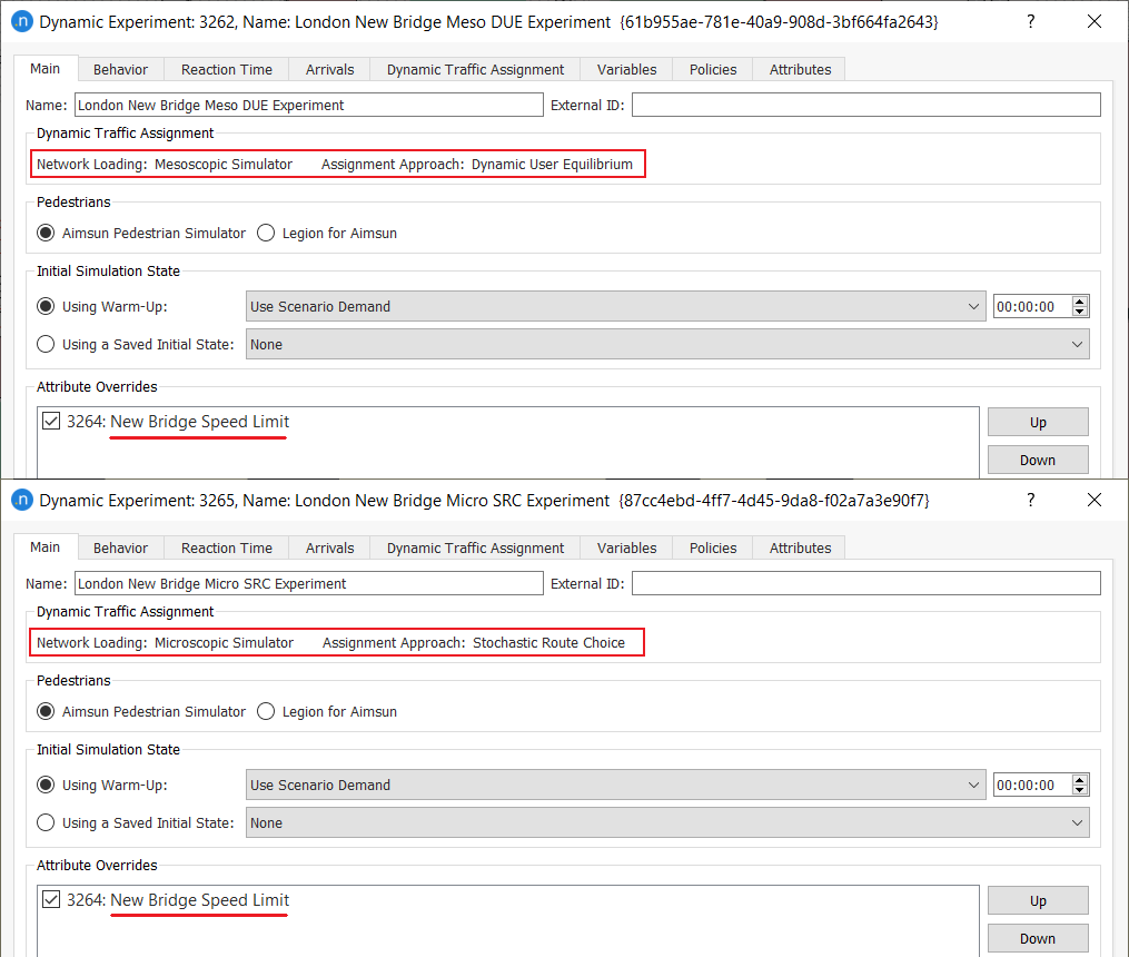 The first experiment is a meso DUE experiment which contains an attribute override of the new speed limit in the area around the new bridge. This produces one result with a random seed.