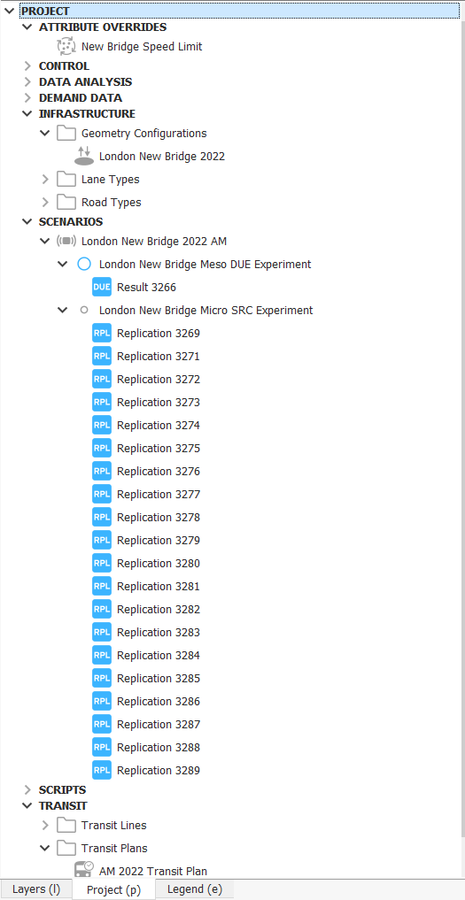 The diagram below illustrates the relationships between scenarios, experiments, results, and replications and is taken from the Project window of an Aimsun Next project.