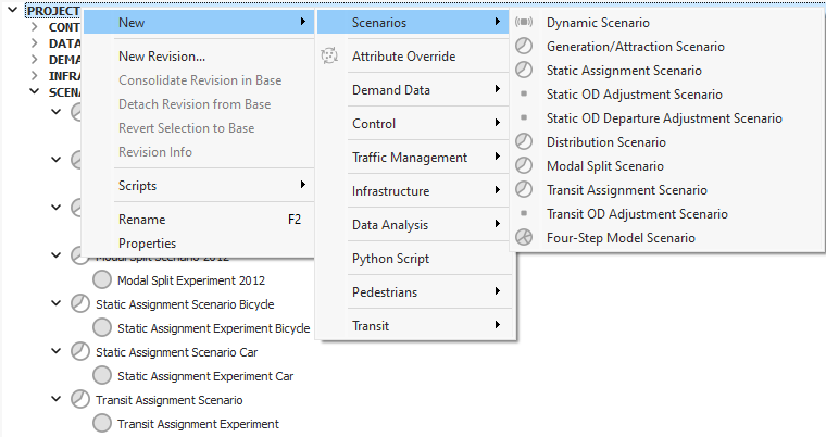 Aimsun Next offers many different types of scenarios, including dynamic scenarios, static scenarios, and travel demand scenarios. The following screenshot of the Project menu illustrates most of the currently available scenarios and the first step of how to create one.