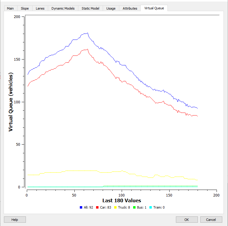 If a Road Section is at the edge of the road network, or at the edge of a sub-area, and there is congestion on that segment that causes a Virtual Queue, then a Virtual Queue tab is created for the section. This tab shows the recent history of the size of the queue for different vehicle types.