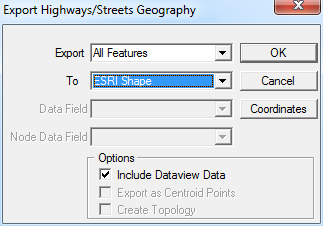 Choose All Features as the filter and ESRI Shape as format, click Coordinates and ensure that the Coordinate System is set as Longitude, Latitude, ensure that the Include Dataview Data option is checked, and finally click OK.