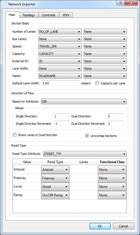 Under Road Type, select the field (typically TYPE or STREET_TYPE) that provides the type of the link and map each different value to a Road Type, assuming these were set up before the import. The Lanes column can be used to set a default number of lanes for the different road types, if it is not specified on a link by link basis.