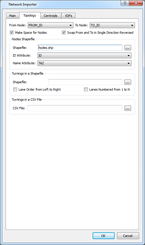 In the Network Import Dialog, the set of conditions to map the attributes, to define the topology, to identify the centroids and centroid connections, and to map the Volume Delay Functions is defined.