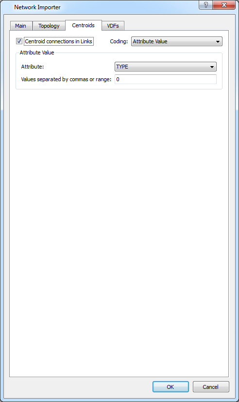 In the Centroids tab, check Centroid Connections in Links and select Attribute Value. Choose the attribute and the value(s) that identify a link as a centroid connection (typically TYPE = 0).