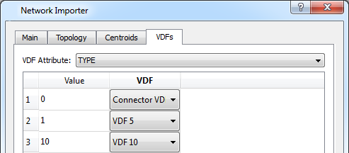 Assuming the volume-delay functions that correspond to the ones used in TransCAD were created before starting the import process, go to the VDFs tab, choose the attribute that should be used to select the function (typically TYPE or LTYPE), and assign one function for each different value. Otherwise the volume delay functions will be associated with the sections according to the Road Type.
