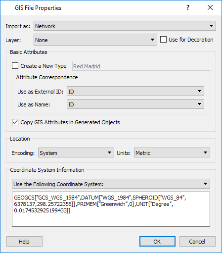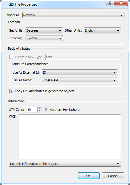 Select the link shapefile recently exported from TransCAD. Choose Import As: Network, set the Location options as appropriate, and select the fields to be used as External ID and as Name for the road sections (Aimsun Next will automatically provide a best guess). The Copy GIS Attributes in generated objects ensures that all the fields in the shapefile will be available as attributes for the objects in the Aimsun model. Verify that the UTM Zone has been recognized correctly and click OK.