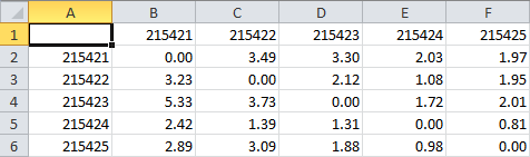 Open the file exported from TransCAD with Excel. Copy the first column, containing the origin identifiers, and paste it transposed, as the first line, containing the destination identifiers. Save the file in CSV format (comma delimited).